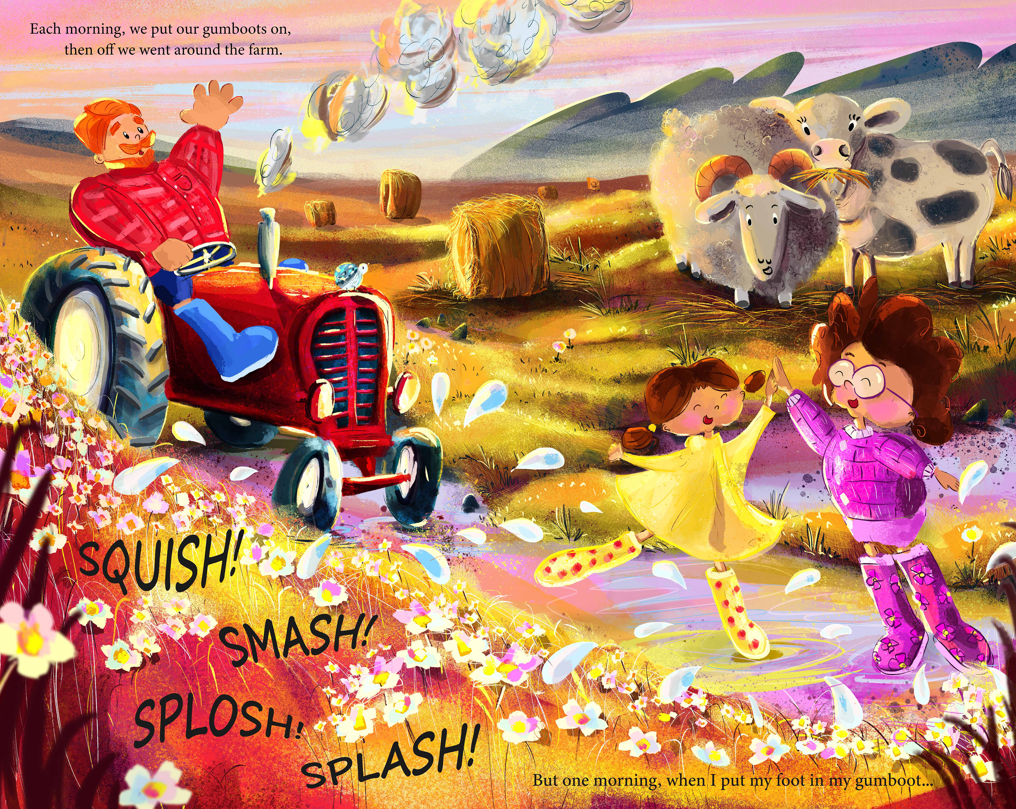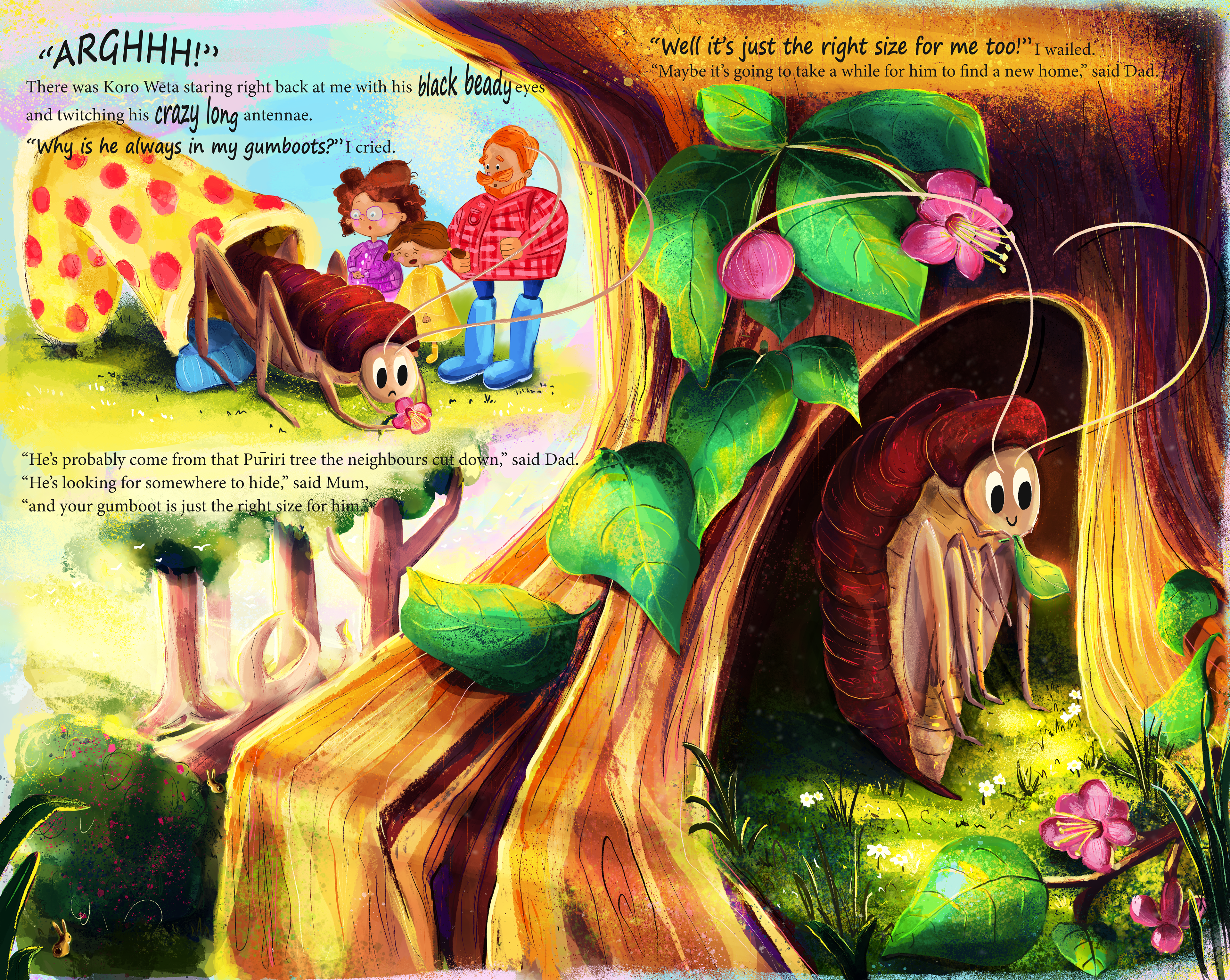 Illustration examples for an unpublished children's picture book about a weta and a gumboot.